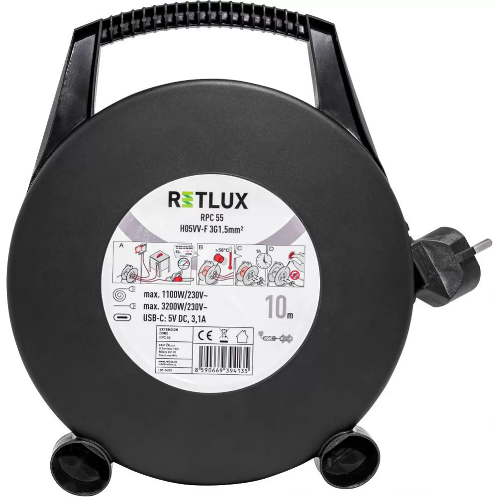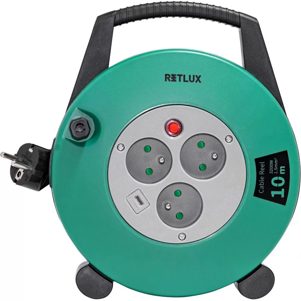 Prodlužovací kabel Retlux RPC 55 Desetimetrový kabel s praktickým navinováním na buben má kromě tří standardních 230V zásuvek také praktický USB-C… Celý popis
