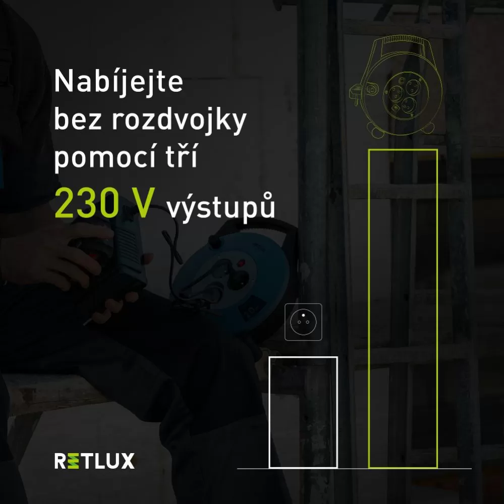 Desetimetrový kabel s praktickým navinováním na buben má kromě tří standardních 230V zásuvek také praktický USB-C vstup. Vedle zapojení elektrických zařízení si tak můžete bez adaptéru snadno nabít i telefon nebo další elektroniku.